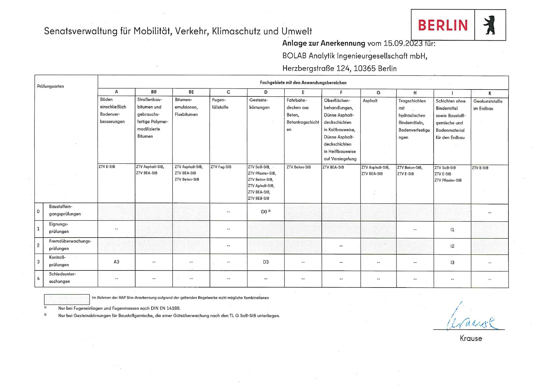 Seit Dezember 2016 ist die BOLAB Analytik Ingenieurgesellschaft mbH eine nach RAP Stra 15 für die Fachgebiete A 3, D 0, D 3, I 1, I 2 und I 3 anerkannte Prüfstelle.